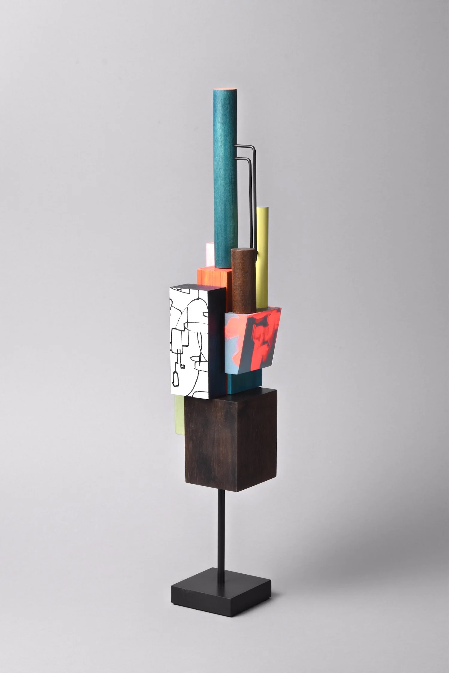 Maple, walnut, steel, oxidized sterling silver, black spinel, ink, gouache